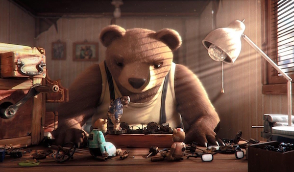 An old bear stands every day on the same street corner, where he tells his history in a little homemade theater.
